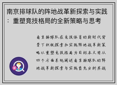 阅读本文围绕“广州篮球队阵地战革新探索与实践”的主题进行深度分析,从多个层面探讨该队在阵地战方面的创新方法及其实际应用效果。首先,文章将分析广州篮球队目前的阵地战体系和技术特点,接着讨论其在实战中的应用表...
